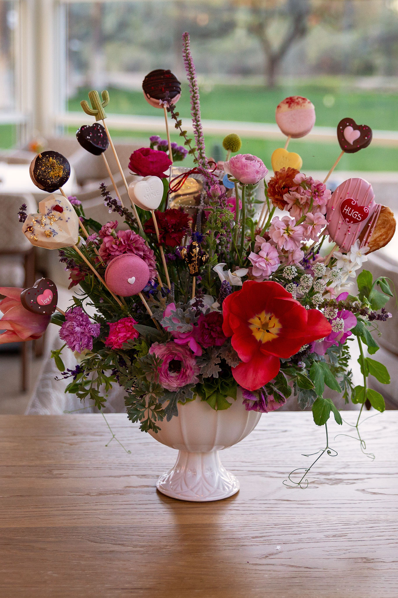2 Handcrafted Mocktails, Chocolate Dipped Fruit & Pretzels, Prickly Pear Popcorn, 2 Seasonal Juices, Saratoga Mineral Water & Petite Floral Bouquet $125